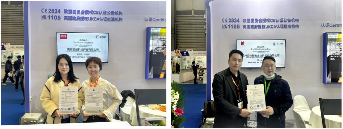 4月14日展会现场,CCQS为荆州思创科技开发有限公司颁发全面罩、半面罩CE认证证书,为温州劳来斯安全防护装备有限公司颁发登山头盔CE认证证书。这标志着该产品符合欧盟个人防护装备法规要求,并允许在欧盟市场投放销售。